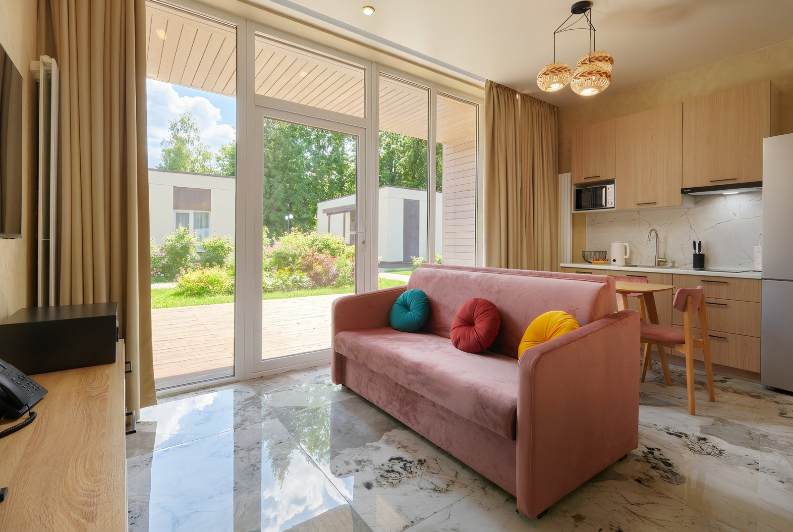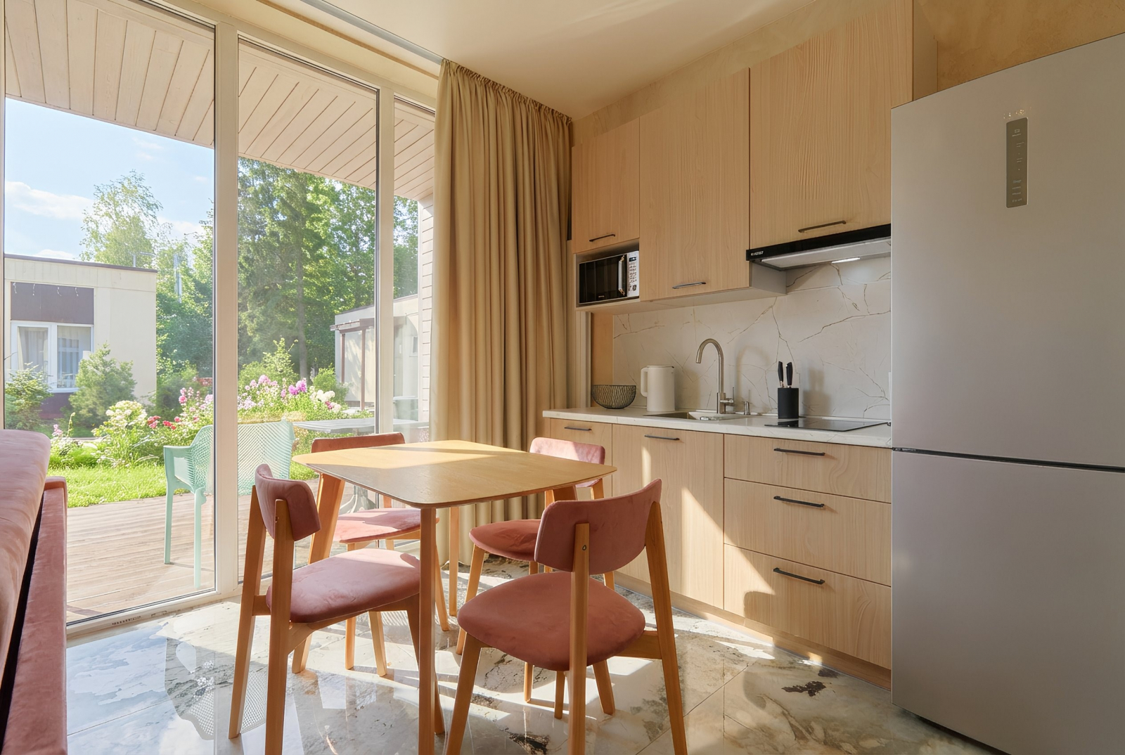 В коттедже расположена гостиная-кухня, спальная комната, веранда.