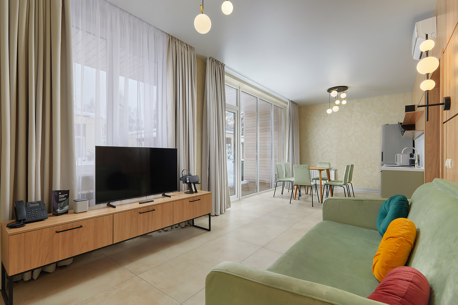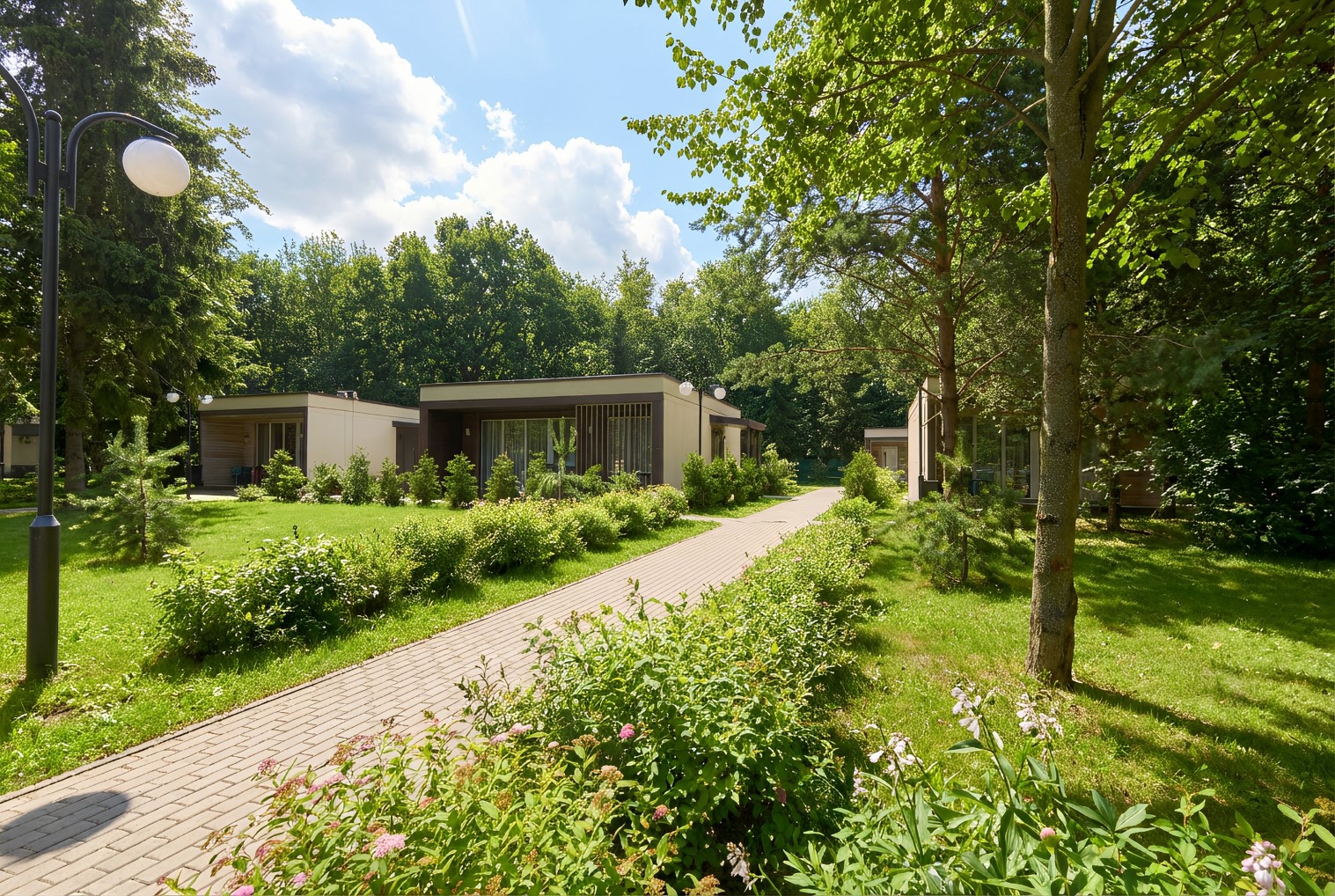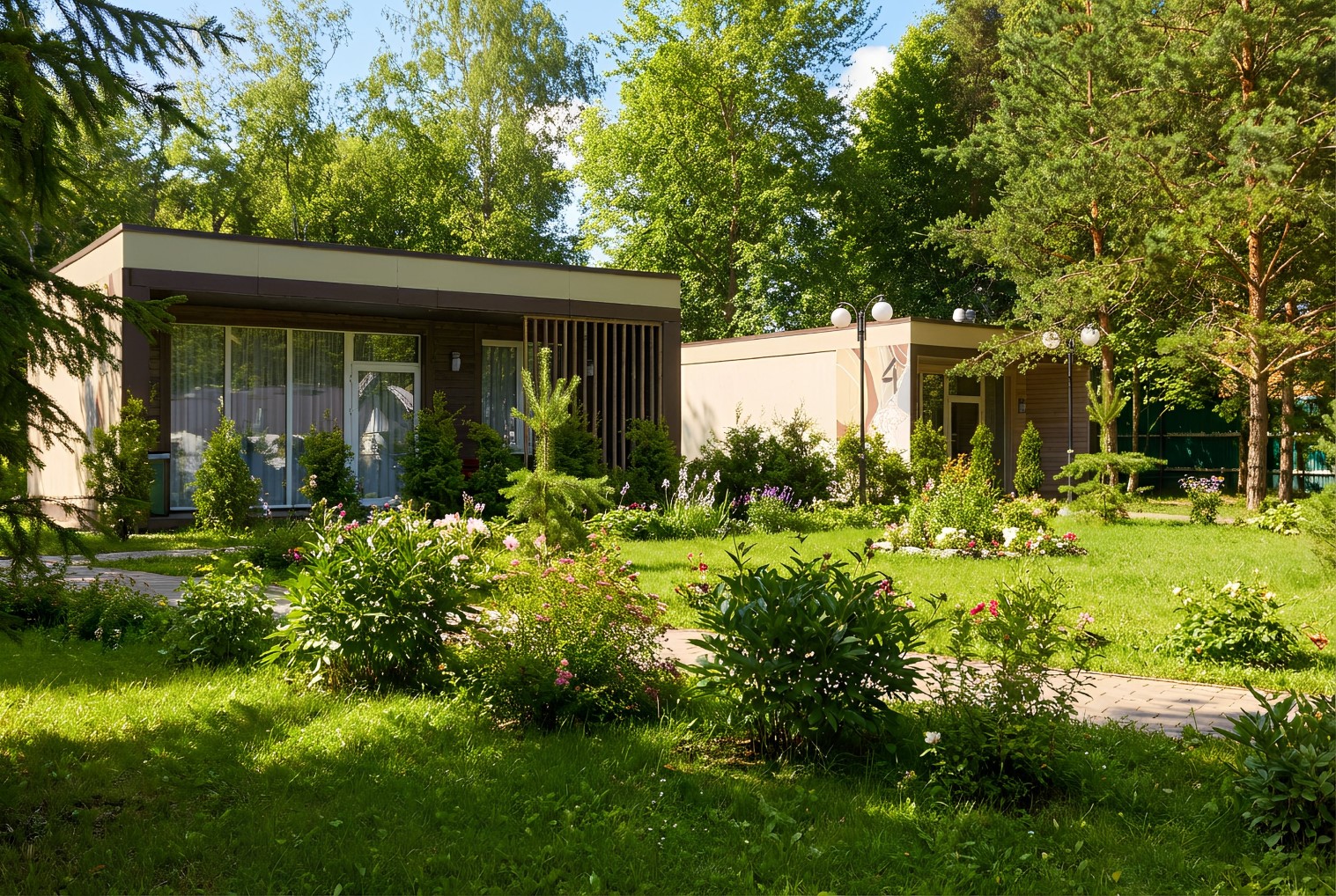 В коттедже расположена гостиная-кухня, две спальные комнаты, гардеробная, душевая комната, веранда.