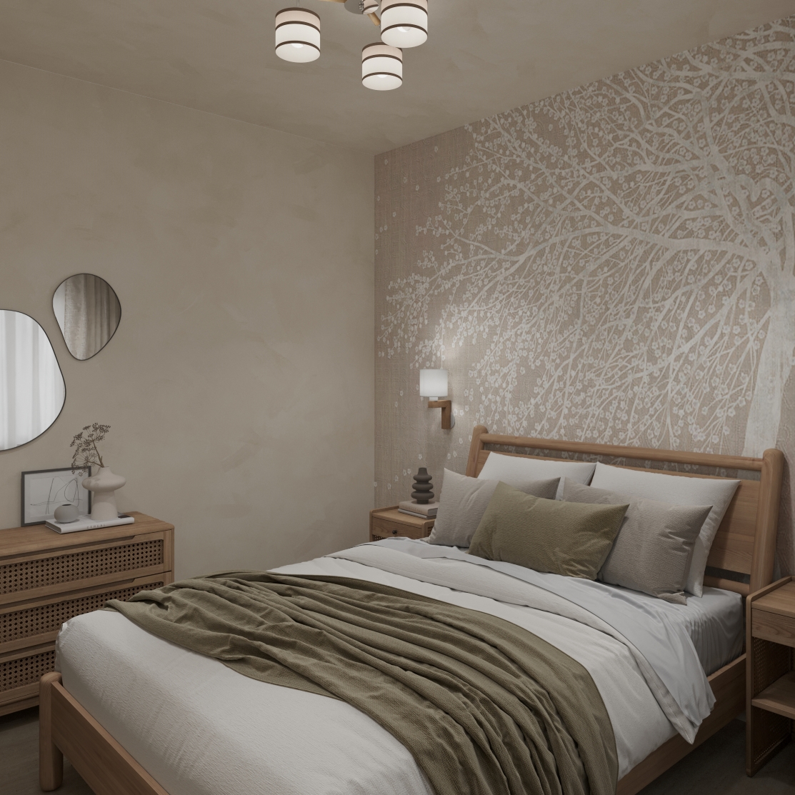 В коттедже расположена гостиная-кухня, две спальные комнаты, гардеробная, душевая комната, веранда.